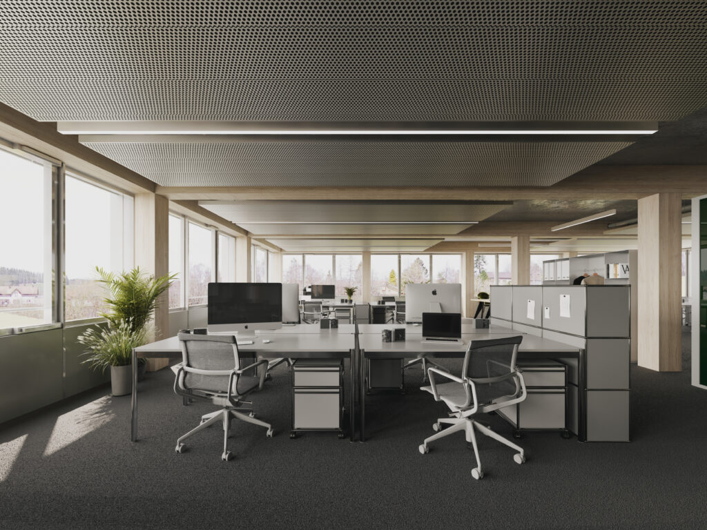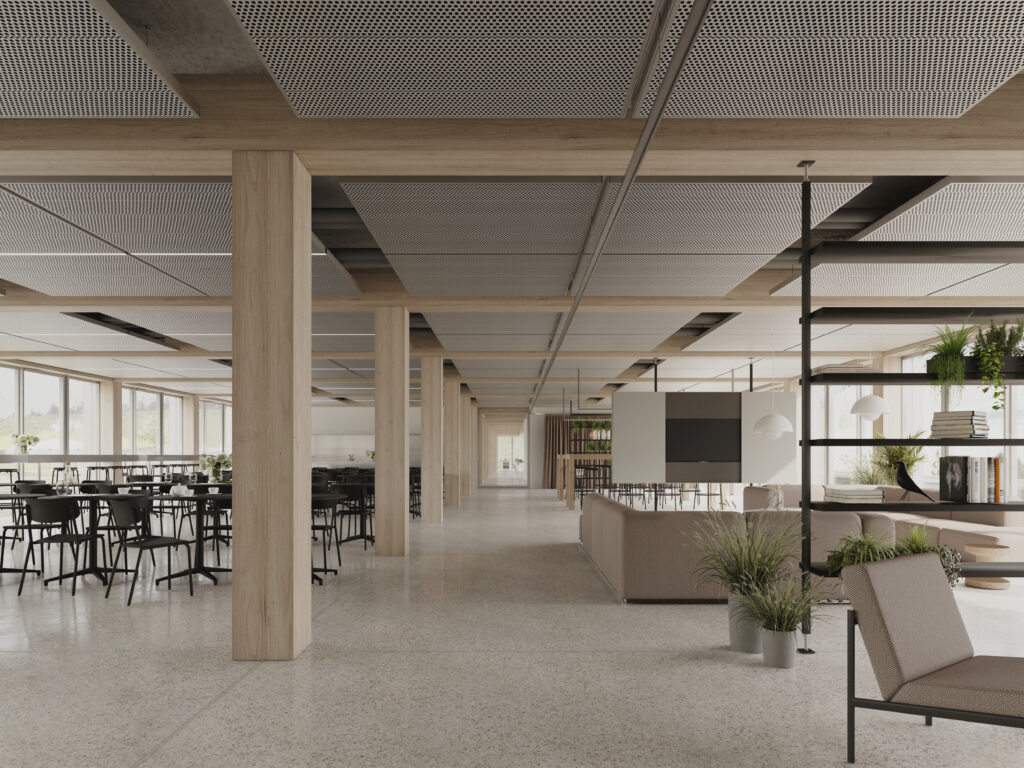 La structure bois se développe sur quatre niveaux de bureaux hors sol, avec une emprise au sol d’environ 15 × 90 m². Le système porteur est réalisé en bois tasseau collé de hêtre (BTC48), permettant une optimisation des sections grâce à la haute résistance et rigidité offertes par cette essence de bois dur. Les planchers sont conçus en système mixte bois-béton : ils se composent de solives en hêtre de section 28 × 40 cm, disposées à un entraxe d’environ 4 m pour franchir des portées de 7,5 m, associées à une dalle béton de 14 cm assurant la collaboration structurelle.