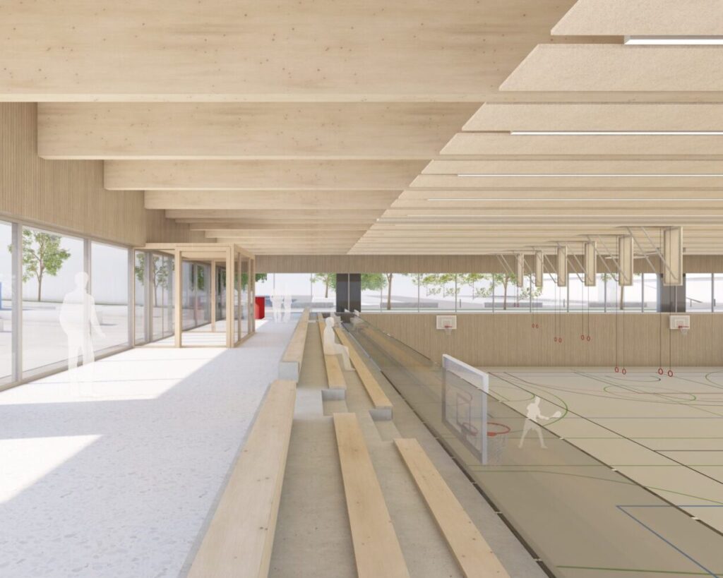 La salle polyvalente de Morges se distingue par une conception structurelle ambitieuse. La toiture est constituée de panneaux en CLT associés à des poutres en lamellé-collé à inertie variable, permettant d’optimiser les portées et d’allier légèreté et performance.
